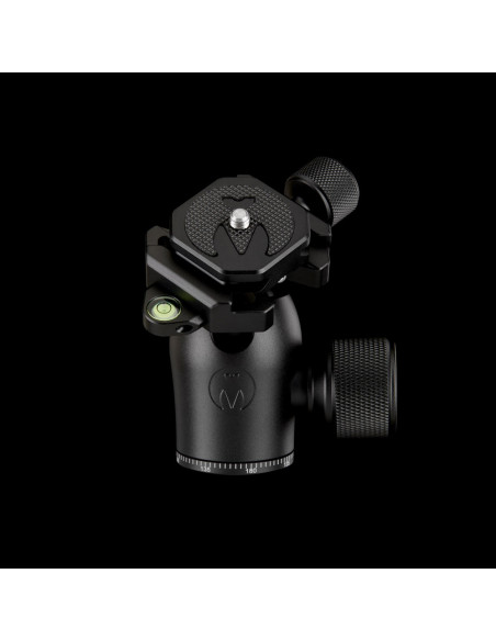 The AirHed Pro features a knurled knob which is used to control the ballhead. The ball can be tightened into a variety of positions, and the entire head can be rotated 360 ̊ on its base. The copper control knob tightens the clamp, so users can ensure their camera is held securely in place. The head features a bubble level, ensuring pictures are all perfectly aligned. ,