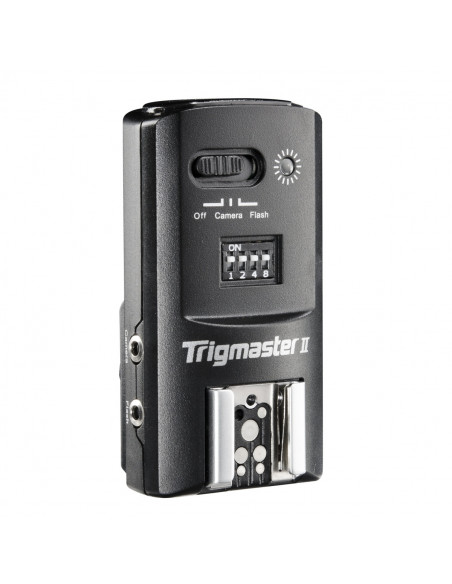 With the Trigmaster II by Aputure you can remotely trigger your system flash, studio flash or your camera. Due to the 16 selectable channels, several photographers can work in the same room. The Trigmaster has a range of up to 120 meters which makes you particularly flexible.