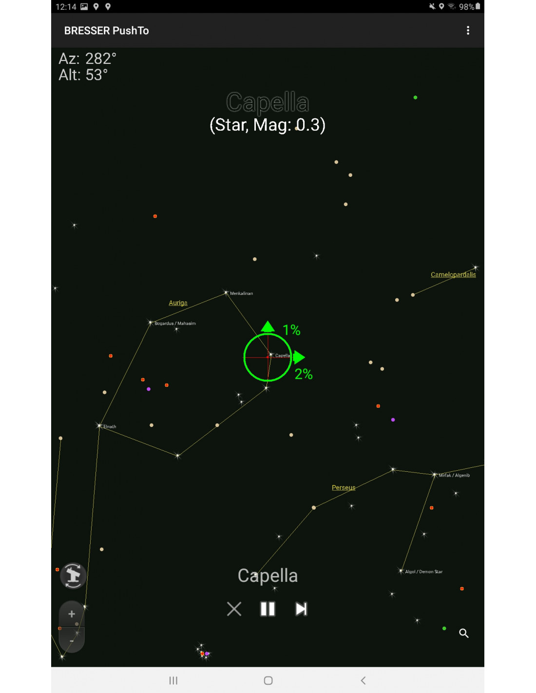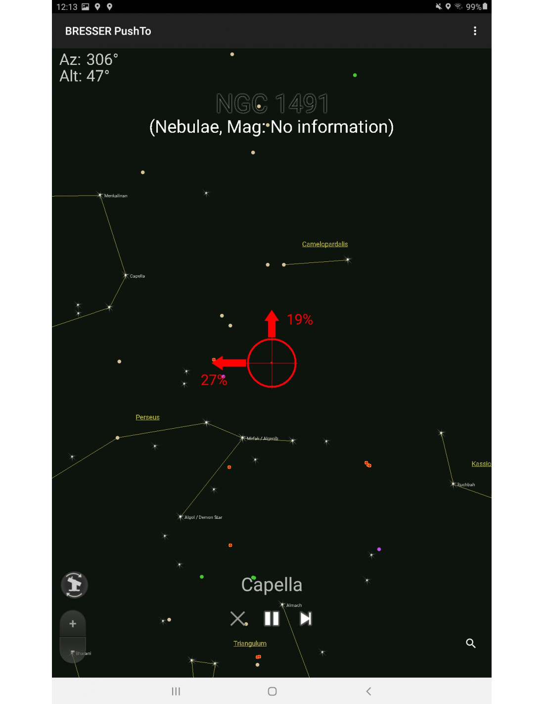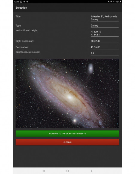 _x000D_ Once the telescope is set up, you can immediately start exploring the cosmos. Simply choose any celestial body with a touch on the PushTo Navigation star map. You’ll see directional arrows in the app, which adjust in size and colour as you close in on your target, ensuring you navigate to it effortlessly. The telescope’s movements seamlessly update the star map in real-time. Once you’ve reached your target, you can immediately admire the celestial spectacle.
