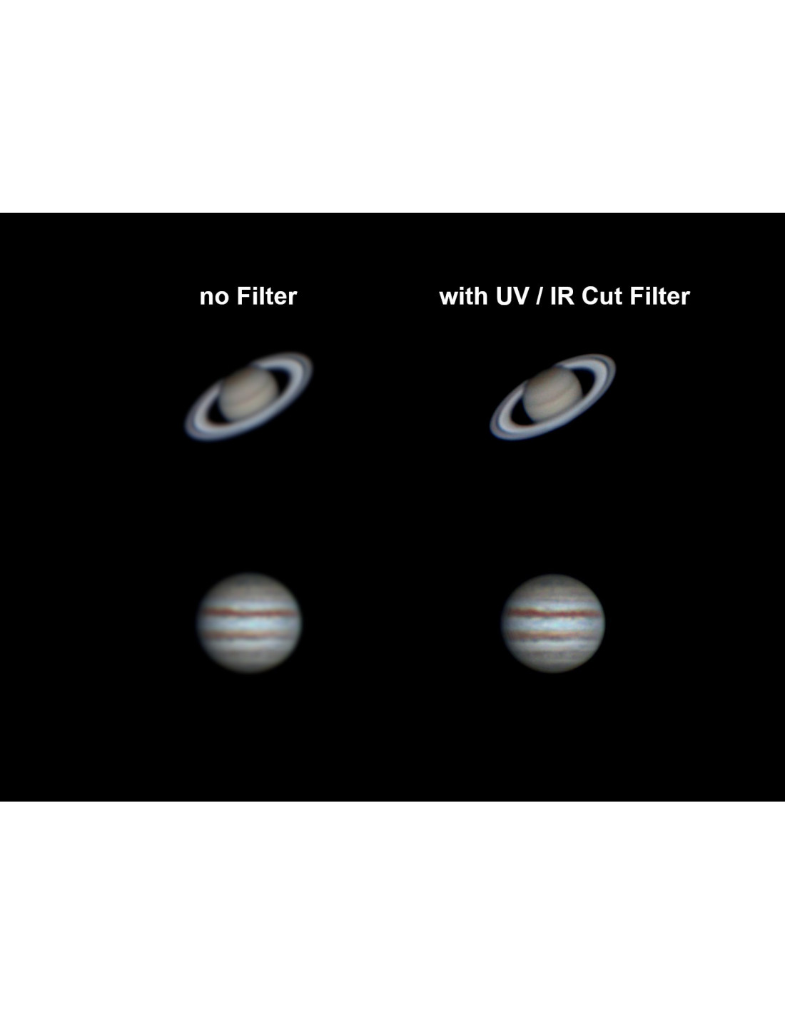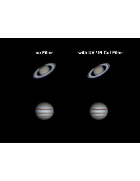 _x000D_ Digital astro cameras have a wide sensitivity range that significantly exceeds the spectrum of visible light. Thus, the wavelengths of invisible light in the ultraviolet and infrared are also captured. This leads inevitably to a small additional and of course unwanted blur. The solution is this UV + IR Cut Filter, which allows only light in the visible range 400 nm to 680 nm to pass through and blocks all other wavelengths of light. As soon as these disturbing light waves are cut off, the sharpness of the image and the contrast are increased. Suddenly, details on the surface of Jupiter, for example, can be seen that were previously only barely visible. A clear plus, which can be achieved by this filter.