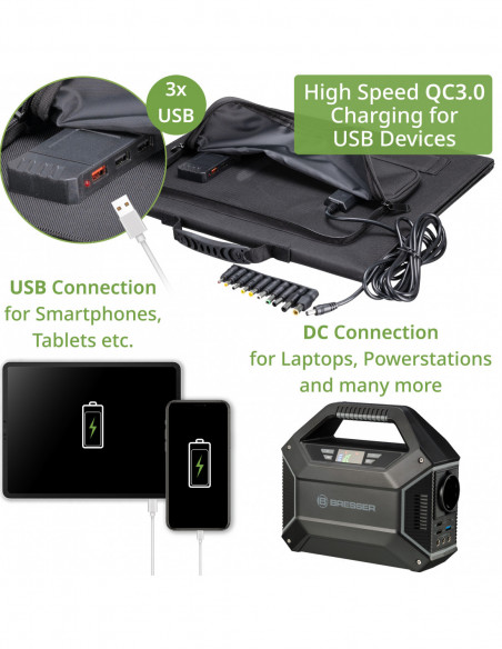_x000D_ The solar charger gets all devices with a USB power supply connection or the above-mentioned DC power plug connection up and running again in no time – e.g. smartphones, tablets, power banks, portable playstations, MP4 players, GPS devices and Bluetooth headphones. For charging large power stations, we recommend the more powerful BRESSER solar panels with at least 60 watts output power – see art. no. 3810050, 3810060, 3810070.