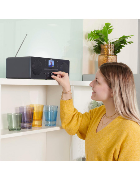 Internet radio with stereo loudspeaker 2x5W, 2.4" TFT colour display, DAB/DAB+ & FM reception, CD/MP3 player and Bluetooth.