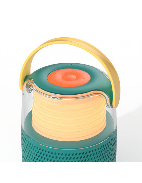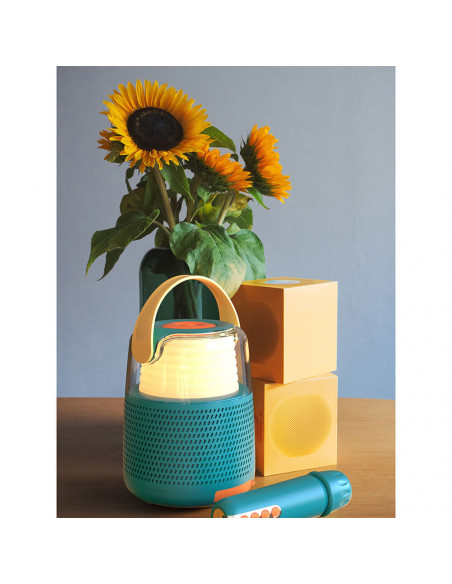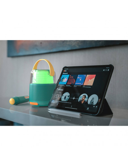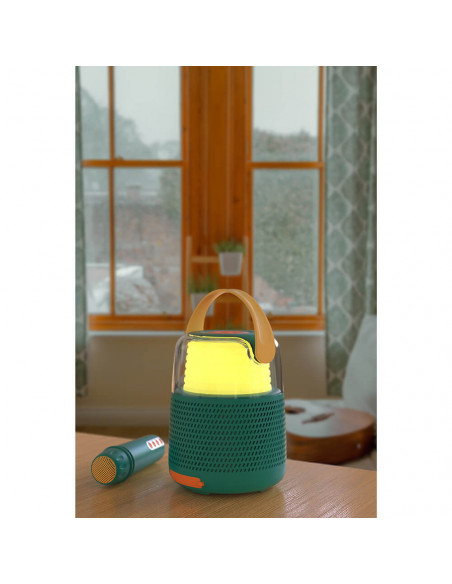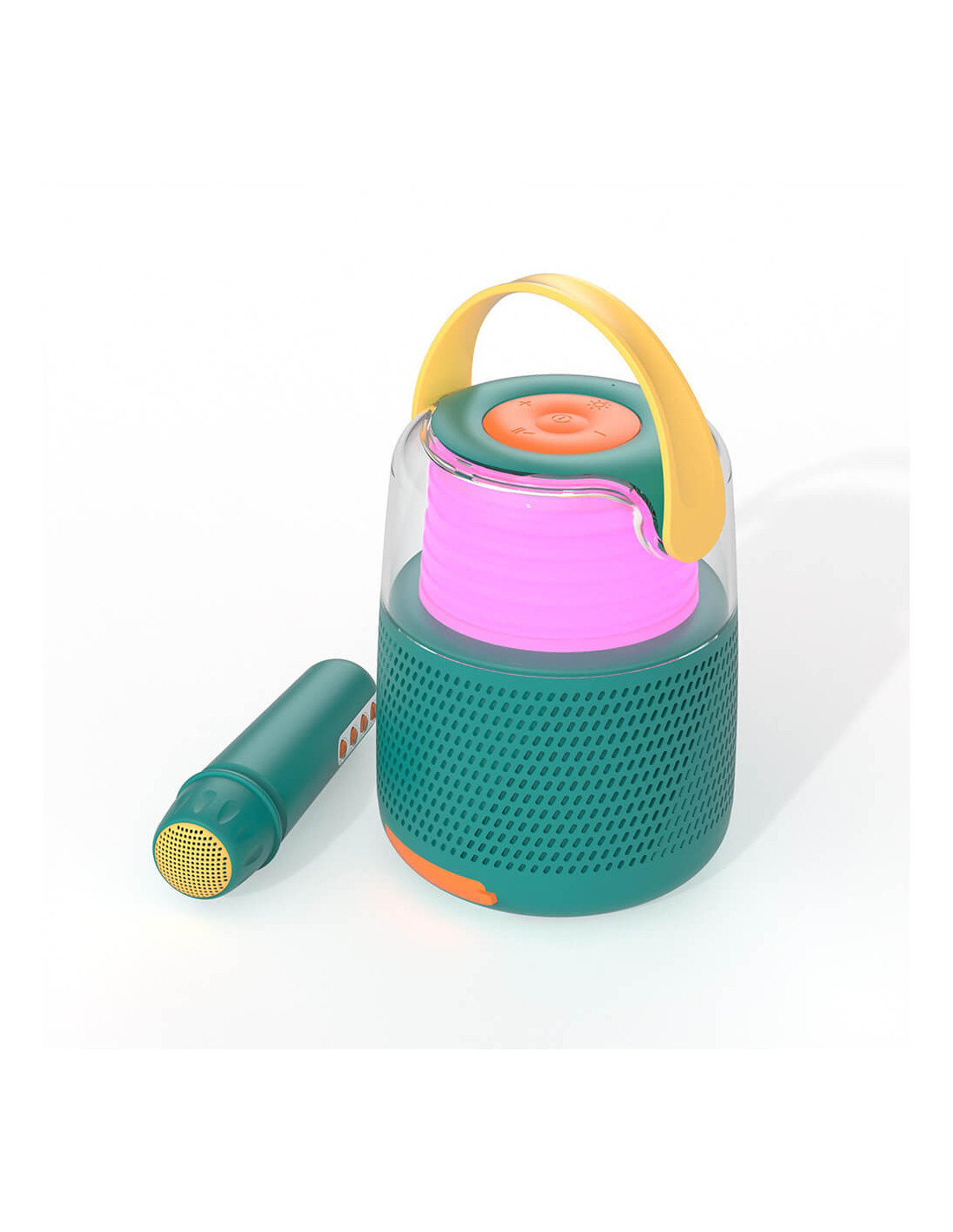 Portable Bluetooth karaoke speaker with wireless microphone and fun sounds and light effects.