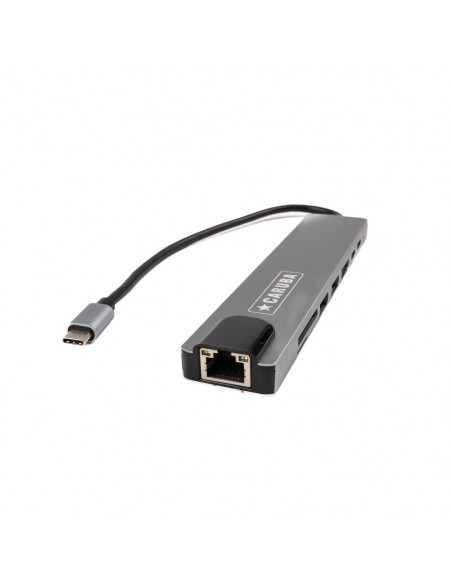 Discover the ultimate in connectivity This compact, dynamic USB HUB 8 in 1 is the key to making full use of your USB device. Highlights Easily expandable to multiple devices Benefit from multiple ports such as PD port, USB A port, HDMI port, Ethernet, USB C port and SD and Micro SD. PD (Power Delivery) Input Give your device a boost. Thanks to 100W, you can quickly charge devices while performing other tasks. Two USB A Ports The USB 3.0 port has a data transfer rate of 5Gbps and the USB 2.0 port has a data transfer rate of 480Mbps. HDMI Port Enter a visual revolution. Connect your device to a display and experience impressive 4K image quality with the HDMI 4K/30Hz port. Ethernet Port Never lose connection again. The Ethernet RJ45 100Mbps port gives you a reliable and fast internet connection for seamless online experiences. Extra USB C Port Increase your connectivity options with an extra USB C 480Mbps port. Now you can connect and sync even more devices. SD & Micro SD Ports Keep your precious memories safe. From holiday photos to business documents, the SD 2.0 and Micro SD 2.0 ports are always there for you. , 1x PD input 100W 1x USB A 3.0 5Gbps 1x USB A 2.0 480Mbps 1x HDMI 4K/30HZ 1x Ethernet RJ45 100Mbps 1x USB C 480Mbps 1x SD 2.0 1x MicroSD 2.0 Cable length: 24 cm (incl. connector) 3 year warranty , Caruba USB HUB 8 in 1 Ethernet