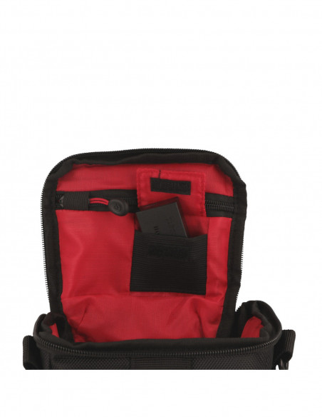 The Compex NB 35 holds a compact camera or system camera with a kit lens attached. On the inside of the flap a zip pocket can be found where small accessories such as memory cards or extra batteries can be stored. Store your lens cap safely on the front of the bag when you shoot.