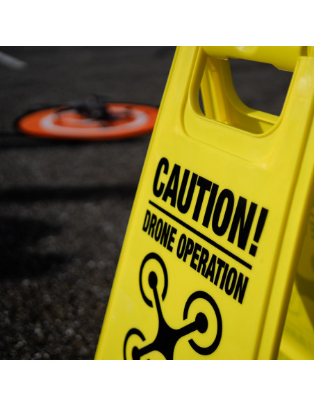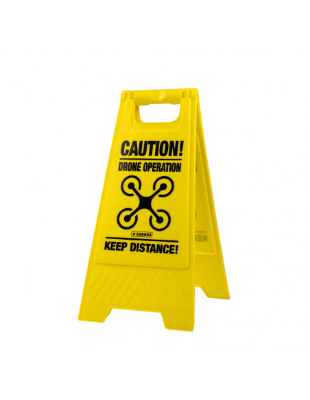 Drone warning sign Put safety first with the Caruba Drone Warning Sign English. With its bright yellow colour and clear message, alert bystanders to the use of drones. Ideal for drone operators, businesses, events and test sites where drones are used regularly. Highlights A clear warning in a bright colour Easy to carry Stickers on two sides Drone operation The drone warning sign increases safety around your workplace by alerting bystanders to an active drone operation. Clear warning The eye catching design and clear icons ensure maximum visibility and clear communication. The sign is stickered on two sides. Easy to carry The sign is collapsible and thanks to the integrated handle, you can easily take it anywhere. Available in several languages. The Caruba warning sign is available in four different languages, Dutch, German, English and French. , Made of high quality material, resistant to rain, wind and sunlight. Eye catching colours and pictograms Height: 61.5 cm Height when unfolded: 57 cm Maximum width: 30 cm Minimum width: 21.5 cm Spread width: 37 cm 3 year warranty