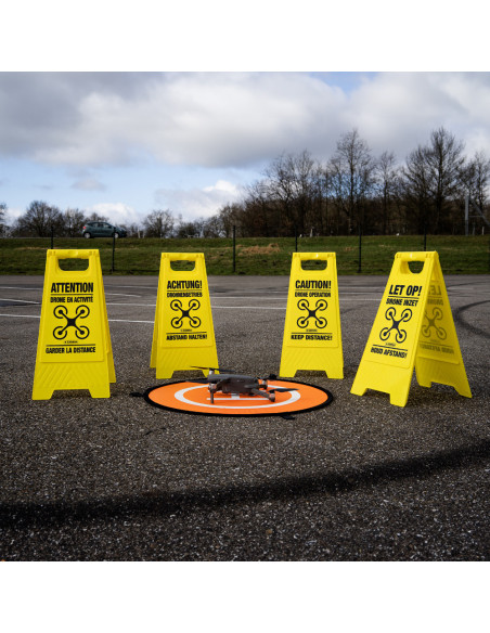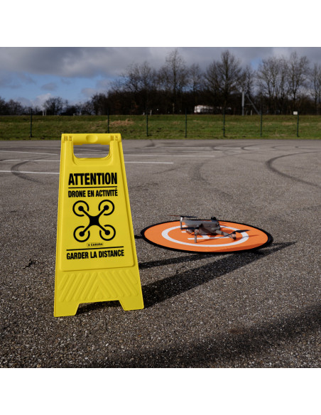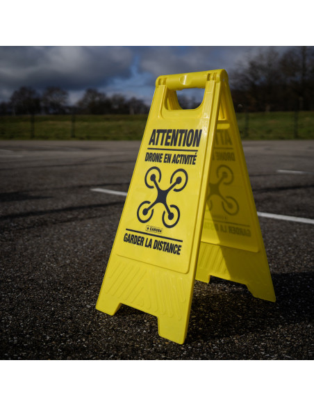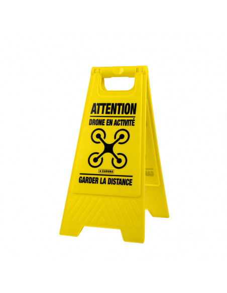 Drone warning sign Put safety first with the Caruba Chevalet signalisation pour Drone Français. With its bright yellow colour and clear message, alert bystanders to the use of drones. Ideal for drone operators, businesses, events and test sites where drones are used regularly. Highlights A clear warning in a bright colour Easy to carry Stickers on two sides Drone operation The drone warning sign increases safety around your workplace by alerting bystanders to an active drone operation. Clear warning The eye catching design and clear icons ensure maximum visibility and clear communication. The sign is stickered on two sides. Easy to carry The sign is collapsible and thanks to the integrated handle, you can easily take it anywhere. Available in several languages. The Caruba warning sign is available in four different languages, Dutch, German, English and French. , Made of high quality material, resistant to rain, wind and sunlight. Eye catching colours and pictograms Height: 61.5 cm Height when unfolded: 57 cm Maximum width: 30 cm Minimum width: 21.5 cm Spread width: 37 cm 3 year warranty
