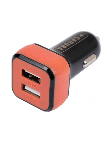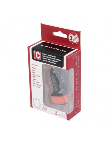 Caruba Duo USB Car Charger 4.8 amp Black / Red The Caruba Duo USB Car charger is a handy USB charger that allows you to charge your smartphone, tablet, the battery of your action cam or any other device with a USB connection when you are in the car. So you can recharge your equipment at any time, even if there is no power outlet nearby. The Caruba car charger connects to your car's cigarette lighter and can charge two devices at the same time. The Smart Intelligent Charging system automatically identifies the connected device to maximize the charging speed. The charger is highly efficient and has a maximum output current of 2.4 Amps per USB output. , Input voltage from 12 to 18 Volt Output voltage of 5 Volt Output current 2.4 Amps per output Dimensions: 29x29x60mm Warranty 3 years , 1 x Caruba Duo USB Car Charger 4.8 amp Black / Red