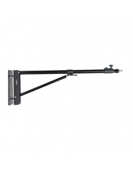 Lighting without a tripod The Caruba Wall Boom 175 cm is a sturdy, extendable wall arm that allows you to easily attach lighting or other studio accessories to the wall. Ideal for photographers and videographers who want to efficiently organise their workspace without a floor tripod. Highlights Organise your workspace efficiently Flexibly adjustable Maximum length up to 175 cm Load capacity up to 7 kg Lighting positioned exactly where you want it The arm can be extended up to 175 cm and can be rotated 160º from left to right and 180º up and down. The removable spigot (1/4â 3/8â) can be positioned straight or at a 90 degree angle. This allows you to position the light exactly where you need it. It has a load capacity of up to 7 kg and, thanks to its solid construction and wall mounting, everything remains stable., Transport length: 91 cm Back plate: 14 x 30 cm Arm length adjustable from 100 cm to 175 cm Rotatable: 160º from left to right and 180º from top to bottom Removable spigot (1/4â 3/8â) can be straight or at a 90º angle Includes mounting hardware 3 year warranty
