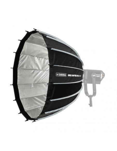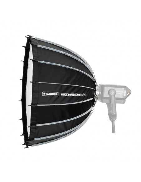 Create beautiful, even light Meet the new generation of softboxes from Caruba. The Caruba Quick Softbox Mark II 90cm is a user friendly, versatile softbox with a Quick setup design. Its Bowens mount speed ring makes it compatible with a wide range of studio lights and flash heads, and thanks to its double diffusion, it offers beautiful, soft lighting for a variety of applications. Highlights Round shape and durable Quick setup design Removable speed ring Round shape and durable The 16 sided shape of the softbox provides a nice round shape and enveloping light quality with deep and large light output. The ends of the rods have protective caps so you can feel free to set the softbox down without damaging it or allowing it to get dirty. Quick setup design With the Quick setup design, you can easily lift and snap on the rods and be ready in 15 seconds, saving you time and effort. Diffusion Soften light output with the included internal diffuser or remove it to increase light output. Both the internal and external diffuser can be used to soften the light. Detachable speed ring The removable Bowens mount speed ring makes it compatible with many light sources. Multiple sizes and optional grid The Caruba Quick Softbox Mark II is available in several sizes with a diameter of 70, 120 or 180 cm. In addition, a grid is available for each size. Look here for the: Caruba Pro Grid for Quick Softbox Mark II 90cm , Dimensions: â 90 cm Quick setup design Detachable Bowens mount 129 mm speedring 16 sided shape 3 year warranty , 1 x Caruba Quick Softbox Mark II 90cm 1 x Internal diffuser 1 x External diffuser 1 x Carrying bag