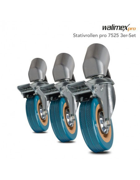 Walimex 7525 heavy duty hjul til lampestativer med 22-25mm runde ben. Sættet består af 3 individuelle hjul som hver kan låses.
