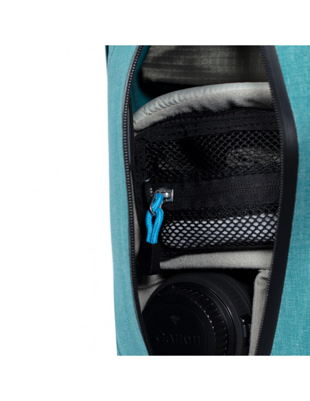 The removal and insertion of the camera insert works with an intelligent, magnetic mounting system. You can reach the camera compartment via the wide zipper on both sides, so you can quickly grab your camera when you turn the bag forward.