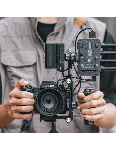 Diverse form The Falcam F22&F38&F50 Quick Release Foldable Half Cage C00B3808 has two rotating axis designs that allow you to easily adjust the angle of the top, side and bottom plate. This allows you to change the shape of the half cage to suit multiple scenarios. Highlights Versatile shape Quick release ecology High expansion capability Attachments The Falcam F22&F38&F50 Quick Release Foldable Half Cage features F22, F38 and F50 quick release mounting points, a 1/4" screw hole, Arri positioning hole, cable clamp positioning hole, strap hole and cold shoe to allow various accessories to be mounted. The bottom plate includes an F38 quick release interface to which a quick release plate with camera can be mounted. Quick and small folding Quickly fold the cage into a small package as big as your hand. This way of folding saves up to 70% in storage space., Model: C00B3808 Colour: black Material: aluminium Dimensions: 96.55 x 61.05 x 128 mm Net weight: 183 g 2 years warranty , 1 x F22&F38&F50 Quick Release Foldable Half Cage