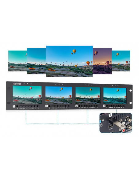 Ideal monitoring solution for studios The SEETEC Q41 Quad 4.5 inch 2RU Rackmount Monitor has four independently controllable screens that can monitor images from different signals. Highlights HD1280 IPS, view details with confidence Quad 2RU rackmount design, compact thin and lightweight design Three colour Tally indicator, enhances team collaboration Portable fly away kits  For live production of large scale events, performances, competitions and other projects, equipment portability should always be considered. Take your Q41 monitors anywhere in the world by mounting them in portable fly away kits. The metal casing can effectively dissipate heat to prevent the portable rack trap too much heat. Perfect for mobile broadcasting vehicle In a mobile broadcasting vehicle, you need to save every inch of space. Q41 has a compact design, ideal for installation on the monitor wall of the broadcasting vehicle. 4X4.5 inch HD display The Q41 is equipped with 4 independent 4.5 inch IPS panel with high resolution, wider field of view and clearly more detailed image. 8bit colour depth with 16.7M colour screen. 2RU Rackmount design Suitable for 19 inch wide cabinet installation with 2RU mounting height and slim metal design that takes up only a small amount of volume, ideal for installation in equipment racks and monitor walls. Custom 3D LUTs loading, film viewing in the field The LUT loading function makes colour calibration easier and more intuitive, optimises workflow and improves work efficiency in the early stages of shooting. You can use the built in LOG or upload .cube files. The user saves the LUT document in the root folder of the USB flash driver and imports it via the USB A to USB C adapter and the device's USB C interface (up to 32 custom files can be imported), ensuring that creative intent is always maintained. Precise waveform monitoring Built in waveform monitoring, you can choose from waveform (RGB Parade, YUV Parade, Y Parade), vector scope, histogram, audio phase and level views, and get accurate waveform monitoring that shows everything you technically need to know about your video and audio signals. The functions can be accessed individually and also support one button to access all scope modes. Q41 becomes the ideal choice for live production monitoring, eliminating the need for separate expensive scopes! Intuitive button controls Each panel is equipped with intuitive buttons to control the display independently, the 2 custom function keys can be set to general function as a hotkey. All buttons are clear and easy to set at a glance. Comprehensive video interfaces Each panel has 3G SDI, HDMI 2.0 support up to 4K 60Hz and CVBS video inputs and outputs. In addition, it also has L/R audio. Suitable for multiple applications. 3 colour TALLY light, enhances team collaboration The Q41 with Tally function, perfect for live broadcasts. The front of each screen features a Tally light that displays in red, green or yellow to indicate that you are on air, previewing or recording. Each rear panel is equipped with an industry standard parallel pin Tally signal connector. Support for 11 languages Built in up to 11 languages, that means the T51 PLUS H is perfect for international location work with different crews because you can just go to the menu and change the language whenever you want!, Model: Q41 Screen size: 4.5"×4 Resolution: 1280×720 pixels Dot pitch; 0.0771 (H)x0.0771 (V) mm Aspect ratio: 16:9 Brightness: 350cd/m² Contrast ratio: 1200:1 Backlight: LED Viewing angle: 80°/80°(L/R) 80°/80°(U/D) Input voltage & current: DC 12V/3A Power consumption: ≤32W Power Switch: DC Operating Temperature: 10°C~50°C Storage Temperature: 20°C~60°C Install Way: Rackmount Input  1 X BNC: 3G SDI 1 X HDMI: HDMI 2.0  1 X BNC: Video 2 X RCA: Audio (L/R) Output  1 X BNC: 3G SDI 1 X HDMI: HDMI 2.0 1 X BNC: Video , 1× Monitor 1× 3A Power Adapter  4× Tally Kit 1× USB A to USB C Adapter 1× User guide