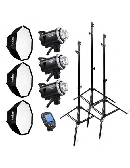 Sæt med 3 x Godox MS200V, 3 x Victory lampestativ, 3 x Godox 80ø softboks og 1 x Godox Xpro II flashtrigger.