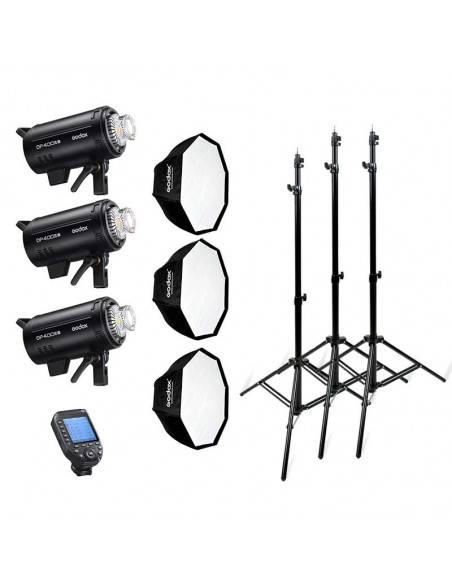 Pakke med 3 x Godox DP400IIIV, 3 x Victory lampestativ, 3 x Godox 95ø softboks og 1 x Godox Xpro II flashtrigger.