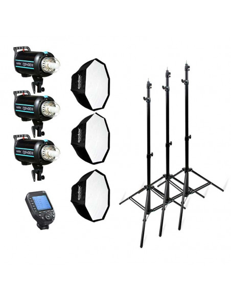 Pakke med 3 x Godox QS400II, 3 x Victory lampestativ, 3 x Godox 95ø softboks og 1 x Godox Xpro II flashtrigger.