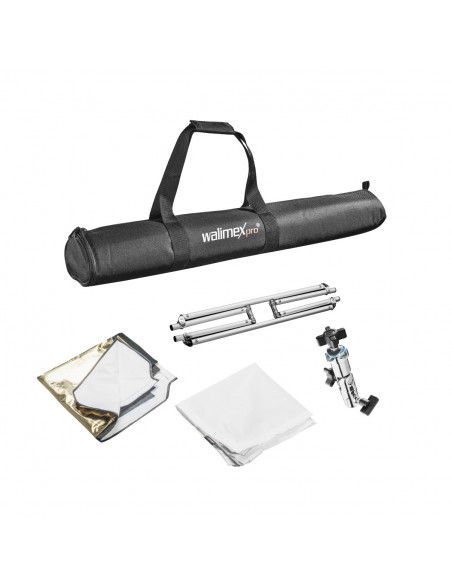 Control and guide light The foldable walimex pro 5-in-1 diffuser panel measuring 145 x 145 cm is wonderfully suited for professional lighting direction, but can also be used for scattering and controlling light in the studio or on location. With this high-quality panel, you perfectly set up both artificial light and natural light. Thanks to the flexible handling, you can control the incidental light so that you can use it perfectly for your purposes. The 5-in-1 diffuser panel comprises a foldable aluminium frame with a quick-lock, an articulated panhead as well as different coverings in gold, silver, white, black and translucent. The diffuser panel comes in a practical carry bag in which all parts fit comfortably.