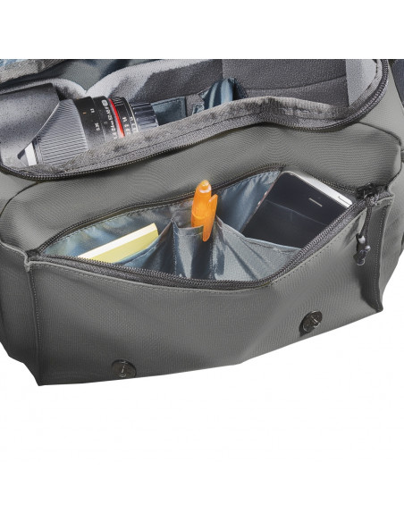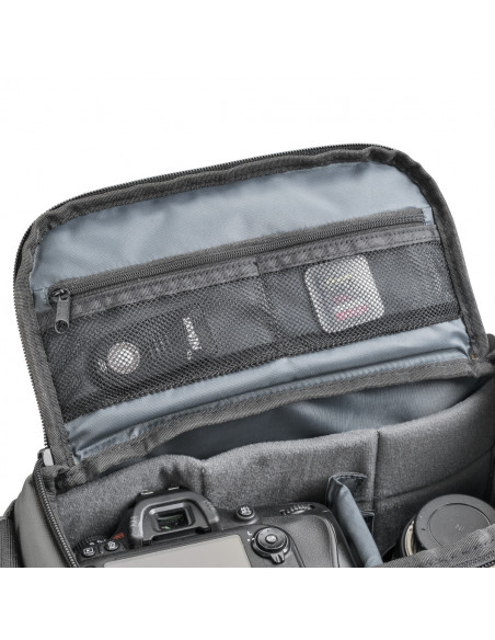 In addition to the main compartment, a zip pocket on the front and a mesh pocket on the top provide room for additional camera accessories such as filters and SD cards. On the sides, you&rsquo