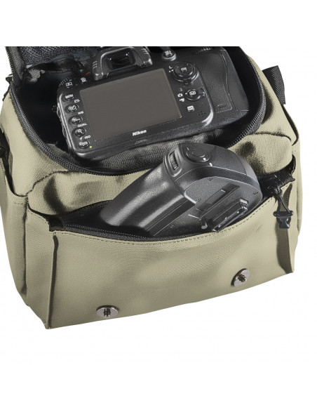 - High-quality camera bag for a DSLR or system camera with a lens attached, another lens or accessories