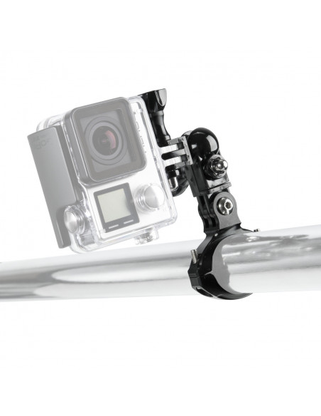 The compact mini ball head dampens effectively shocks and vibrations and thus allows quieter action videos. The ball head can be infinitely variable and can even be brought into portrait format. The diameter of the ball is about 15 mm