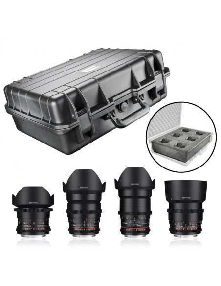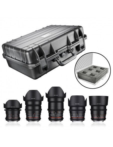 - Basic set II with all important Samyang full-frame Video DSLR lenses. This set is delivered with the sturdy outdoor protection case incl. a high-quality foam plastic inlay Made in Germany from mantona. The lenses with a focal length range from 14 mm to 85 mm form a solid base for successful work.