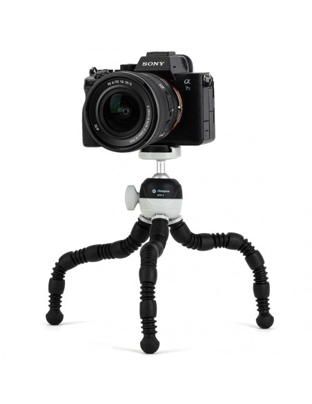 Multifunctional flexible travel tripod The Fotopro UFO 3 Flexible Tripod is made with high density rubber coated legs, making it sturdy and durable. It can be bent into almost any shape and attached to almost any surface, including angled and smooth surfaces. It is suitable for both your camera and phone due to the integrated phone clip. Highlights Funny and compact design Flexible shape, very practical For camera & phone The ball head rotates 360º so you can take shots from different angles. It has a 1/4" 20 connection to which phone holder or camera can be attached., Model: UFO 3 Dimensions: 271 x 62 x 45 mm Weight: 250 g Max. load capacity: 2 kg 1/4 standard screw Phone clip range: 65 105 mm 6 year warranty , 1 x Fotopro UFO 3 Flexible Tripod