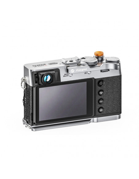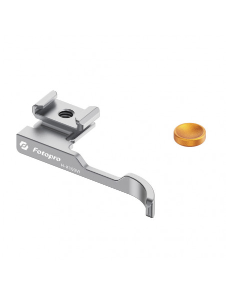 Give yourself extra comfort The Fotopro H X100VI Thumb Grip Silver lets you hold your camera comfortably and securely. The aluminium grip is durable and fits your camera perfectly. Attach the grip via the hotshoe connection. You can just keep using all the camera's buttons., Dimensions thumb grip: 68 x 34 x 15 mm Weight: 85 g Custom models: For all models of Fujifilm cameras Materials: Aluminium Release button: Dia. DI2 x 5 Release button weight: 1 g 6 year warranty