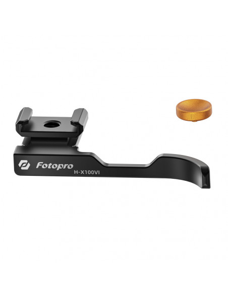 Give yourself extra comfort The Fotopro H X100VI Thumb Grip Black lets you hold your camera comfortably and securely. The aluminium grip is durable and fits your camera perfectly. Attach the grip via the hotshoe connection. You can just keep using all the camera's buttons., Dimensions thumb grip: 68 x 34 x 15 mm Weight: 85 g Custom models: For all models of Fujifilm cameras Materials: Aluminium Release button: Dia. DI2 x 5 Release button weight: 1 g 6 year warranty