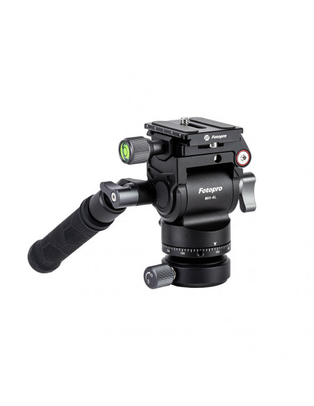 For professional video recordings Using the Fotopro MH 4L Video Head, you can easily and quickly take stable shots. The head with hydraulic function can be rotated 360 degrees and tilted. The compact MH 4A video head weighs only 400 grams, making it easy to carry. Highlights Lightweight only 0.46kg Vertical shot for Shorts and Tiktok Smooth damping Universal 1/4" interface Flexible Adjustable for left and right handers, the handle is tiltable from 55º to 90º and the video head rotates 360º. The prevention button prevents video head loosening when you turn. The built in spirit level means you can always position it correctly. The handle is adjustable from 158 to 248 mm. The video head features a 1/4'' universal interface so you can easily use it for different devices. Durable and strong The MH 4L has CNC machining and is widely applicable for various mirrorless cameras and SLR cameras, even with the use of 70 200 lenses. A magnetically attached hex key is included to adjust the setting of the aluminium tripod head., Compact and weighs only 460 grams 360 degrees rotatable 90/ 55 degrees tiltable Base diameter: 43 mm Maximum load capacity: 3 kg 1/4" and 3/8" screw connections Handle can be placed left and right Handle length: 158 248 mm 6 year warranty