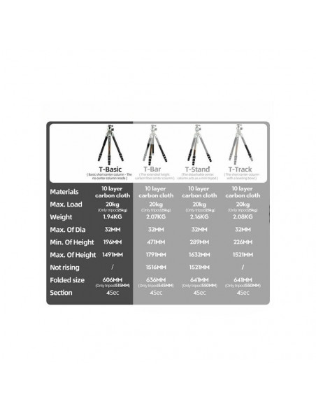 The all terrain tripod The Fotopro T1 Plus+TH 1M+T Basic Photo Tripod is robust and a versatile tripod which is suitable for any terrain and can withstand extreme temperatures from 40°C to 70°C. Highlights Robust and versatile tripod Suitable for any terrain Carries up to 20 kg Lightweight and durable The T1 Plus+TH 1M+T Basic Photo Tripod is made of 10 layer woven carbon fibre fabric and 100% carbon fibre fibre, it combines sturdiness with portability. With its 32 diameter tube thickness, it is strong and stable and has a carrying capacity of up to 20 kg. The tripod is equipped with TH 1M ball head which has a load capacity of up to 20 kg. The ball head is removable allowing you to place the T base on the tripod., Base short central column Mode without central column Weight: 1.94 kg Min. height: 196 mm Max. height: 1491 mm Folded height: 606 mm Sections: 4 Tube thickness: â32 T Base: Dimensions: 75 x 75 x 57 mm T Base: Weight: 0.11 kg TH 1M: Max. load 20KG 6 years warranty , 1 x Fotopro T1 Plus+TH 1M+T Basic Photo Tripod