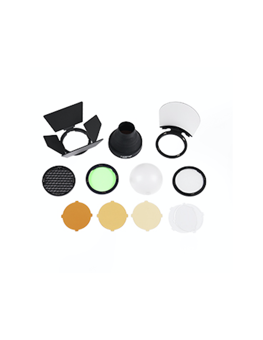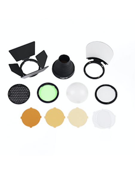 The Godox AK R1 Accessory Kit offers various parts to adjust the light effect. The kit consists of a diffusion ball, various color filters, a honey comb and a snoot. Via the magnetic connection on the R1, the accessories are easy to attach by clicking them on, as it were.