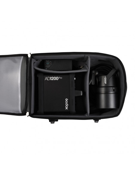 Hård rulletaske og rygsæk i en til AD1200Pro Kit, batterioplader, AC-adapter, bærbar flash hoved og transmitter. 37 x 55 x 30cm kompakt kasse kan passe en AD1200 Pro flash hoved, et batteri drevet base, og de tilhørende tilbehør. Den har et foldehåndtag og hjul til nem transport, plus to udvendige lynlås lommer, og et par udvendige stropper til fastgørelse af en light stand eller tripod.