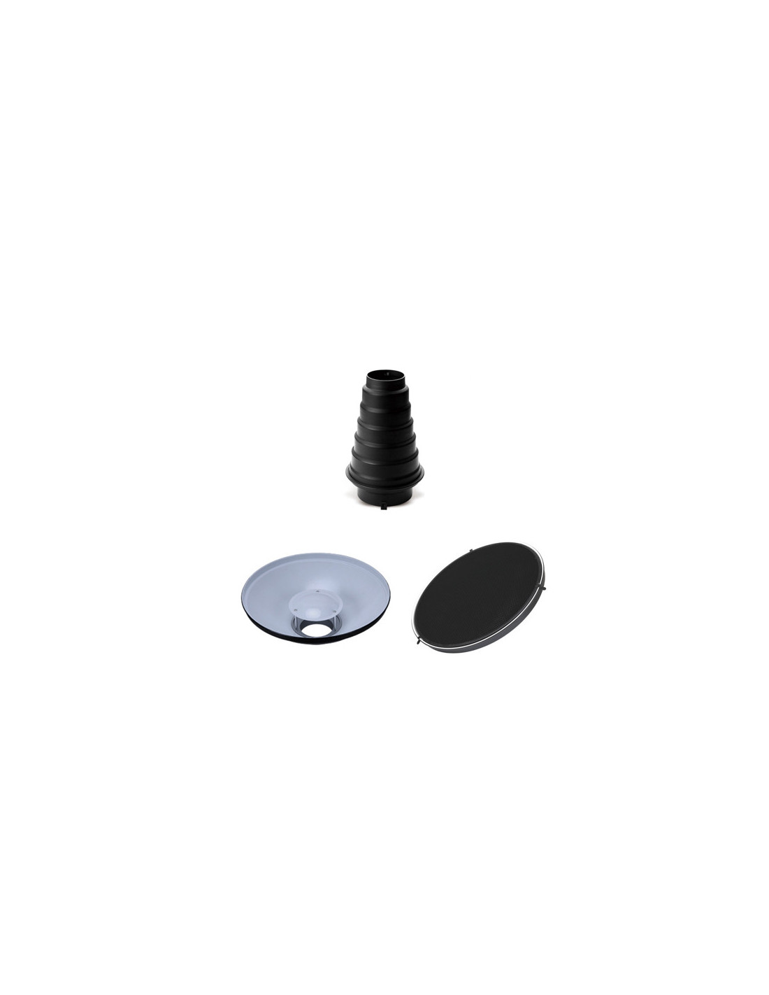The Godox Studio Accessory Set consists of the Godox Snoot SN 01 with Honey Comb Bowens, Godox BDR W550 Beauty Dish Reflector White 55cm, and Godox Honey Comb Grid C550mm.
