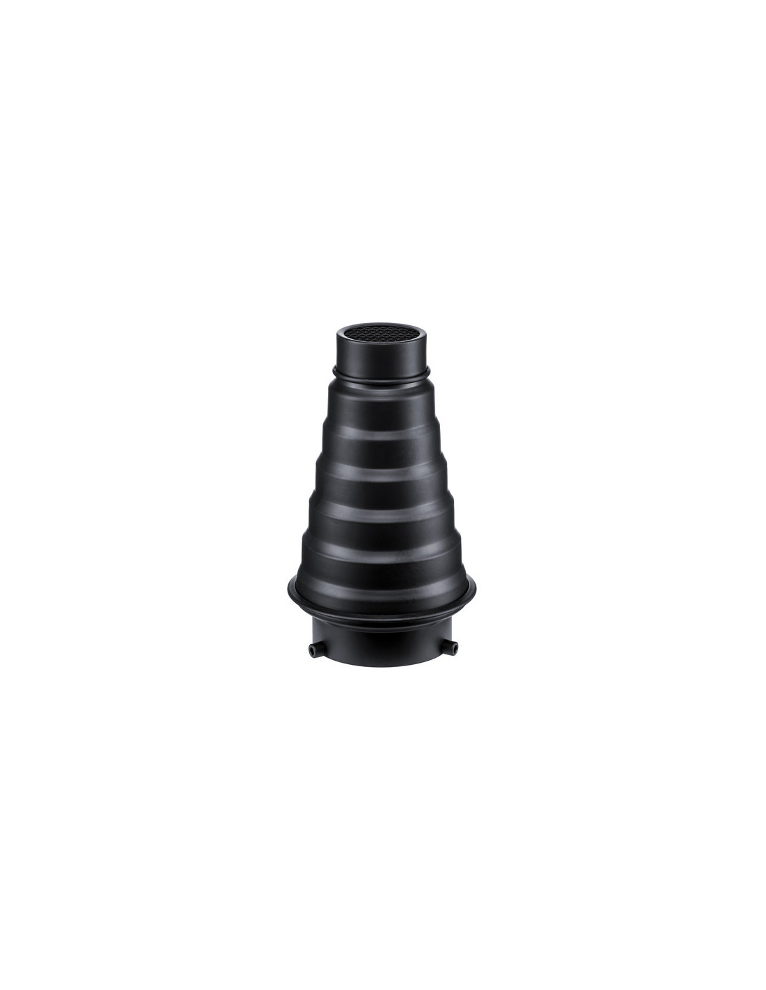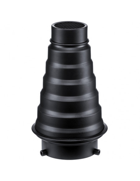 A Honey Comb grid narrows the spread of light from a lamp. Use these grids on the compatible reflectors to add dramatic highlights to backgrounds, for example. A grid also reduces the contrast between shadows and highlights. ,Godox Snoot SN 01 with Honey Comb Bowens
