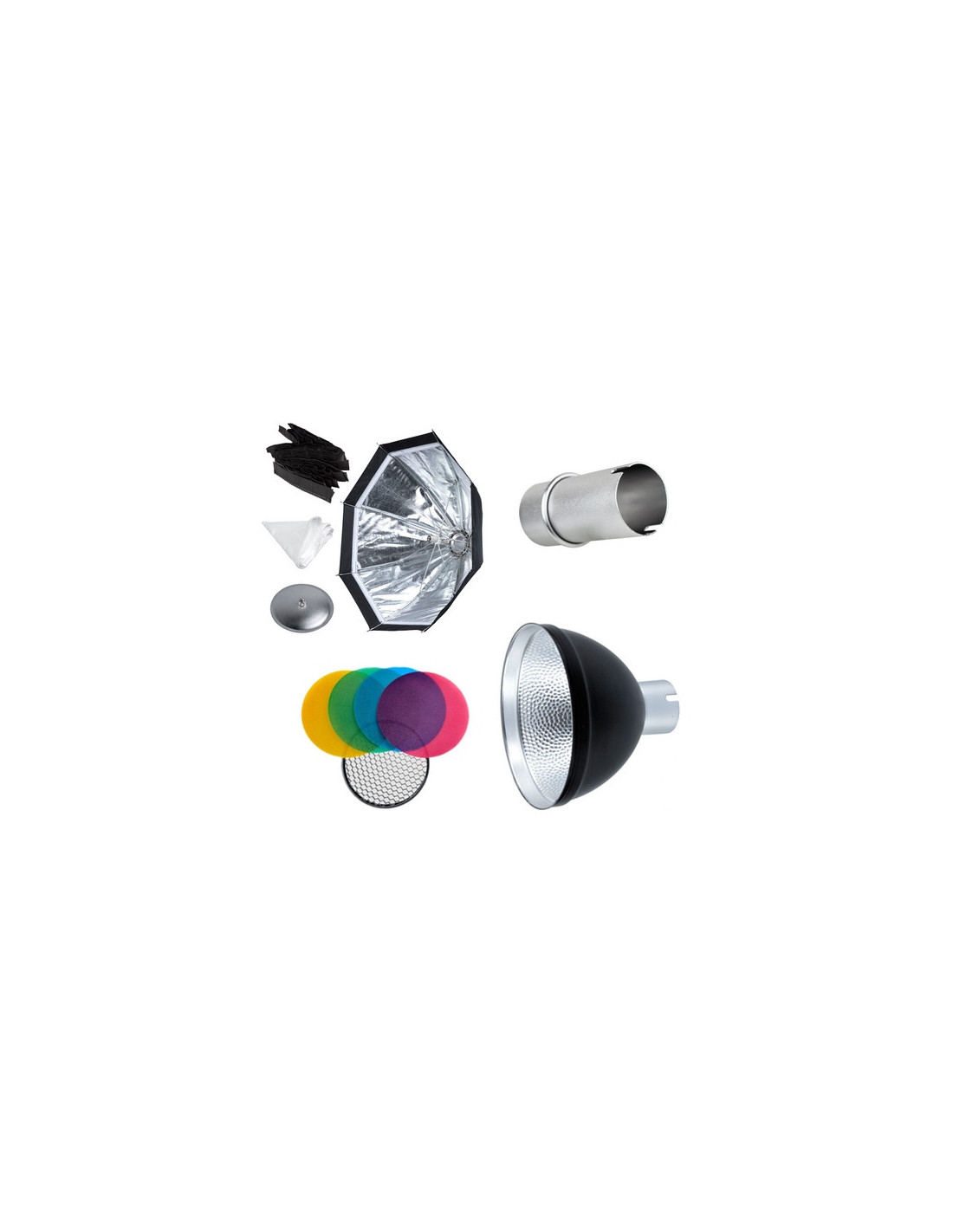 Med Godox AD200 tilbehørssæt har du komplet udstyr til din Godox AD200 flash derhjemme. Sættet består af et softbox med grid, et reflector, et reflector sæt med farvefiltre og grid og en beskyttelseshætte til dit flash rør af AD200.
