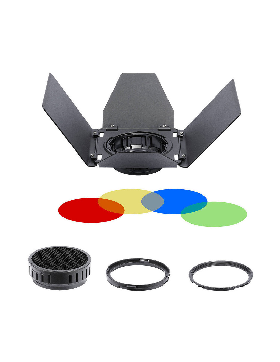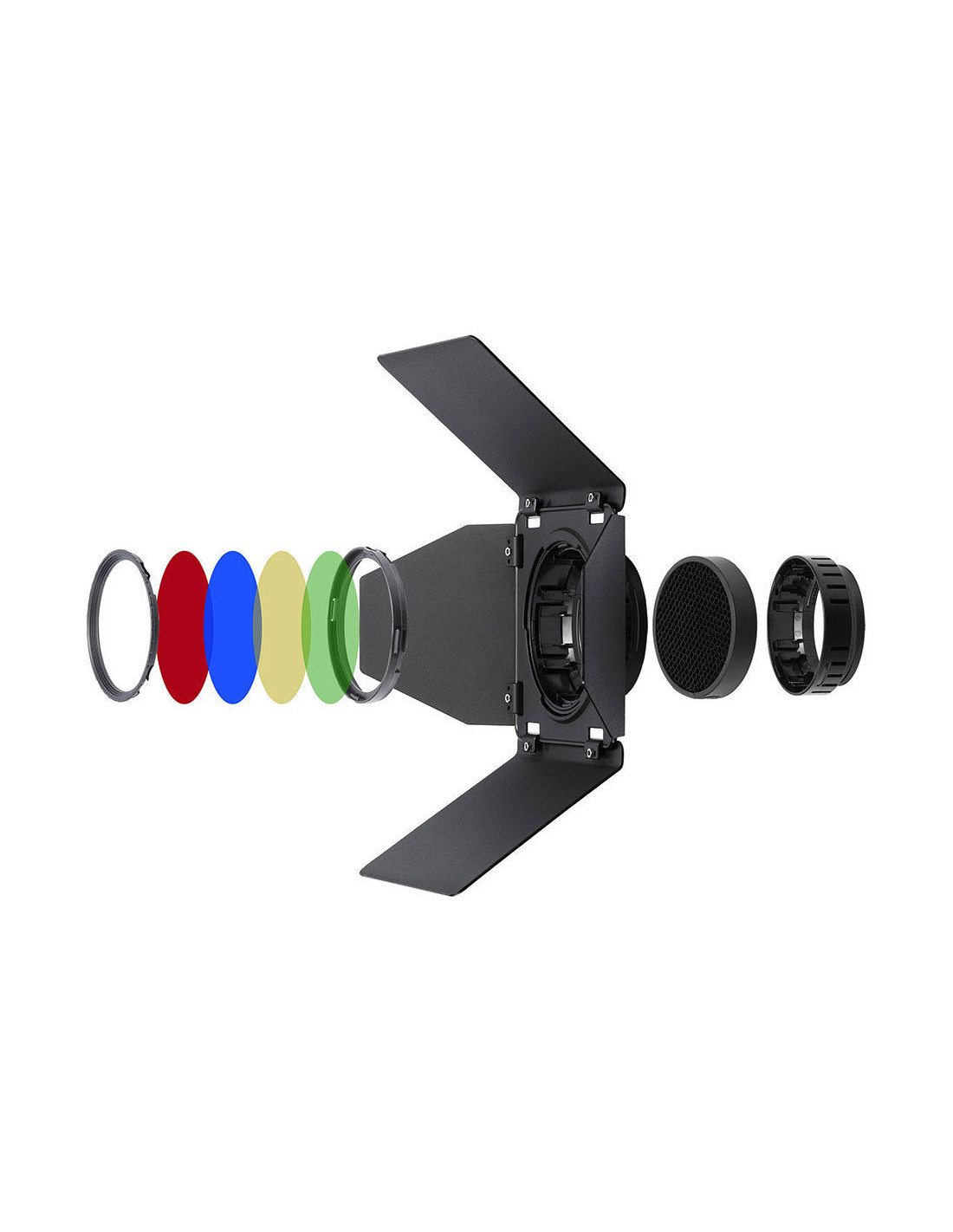 The barndoor has a 4 valve design. Use the valves to direct the AD300 Pro's light beam exactly where you want it. The kit includes a barndoor with 4 valves, a diffuse filter and 4 color filters in the colors yellow, green, red and blue. With the 4 color filters you can create creative light effects in an instant.