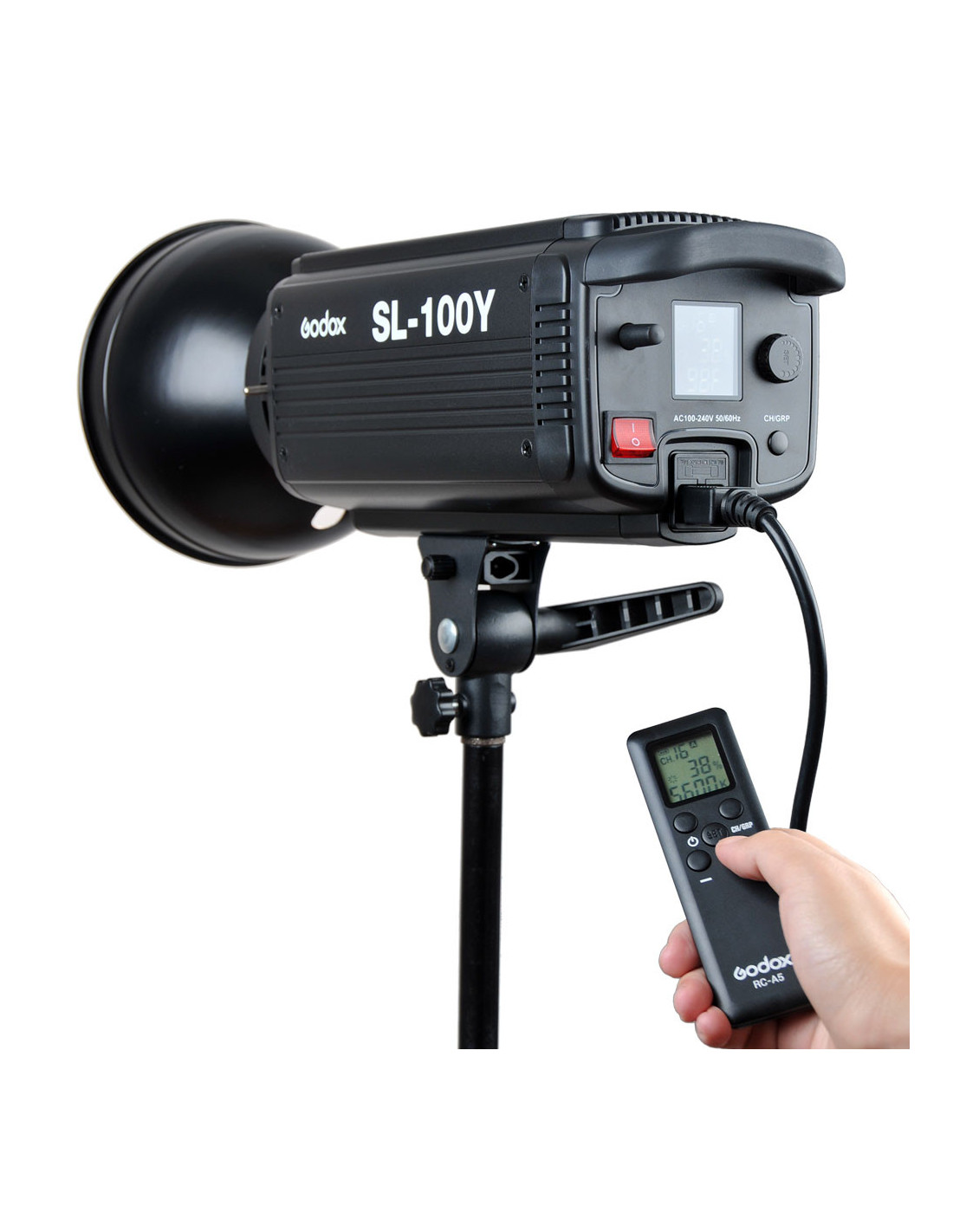 Lygtens lysstyrke kan indstilles fra 10% til fuld effekt. Ved fuld effekt, tilbyder SL100Y en lysstyrke på op til 6500 Lux, i en afstand af en meter fra dit emne. (Med standard reflector) lysstyrken kan justeres med knapperne på bagsiden af Godox SL100Y LED-lampen, men også med den valgfrie fjernbetjening. Denne handy RC A5 fjernbetjening control har en vifte af op til tyve meter. Fordi du har mulighed for at opdele lampen i en af seksten forskellige kanaler og seks grupper, er det muligt at gruppere flere lamper af denne type og justere intensiteten pr. gruppe.