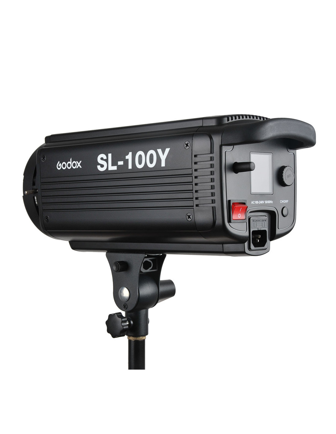 The display on the back clearly shows the most current settings. In addition, the last used settings are automatically saved by the SL100Y. The versatility of the lamp is made possible by the Bowens S bayonet mount, which makes it possible to attach all kinds of light distorters to the lamp. There is also an umbrella holder.