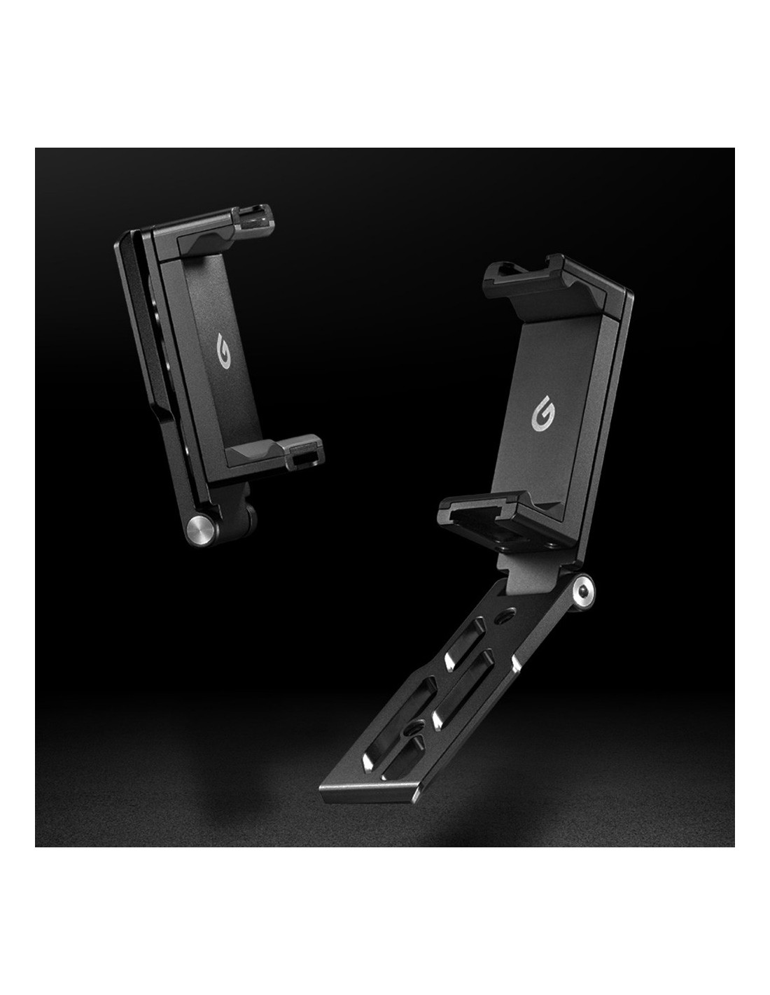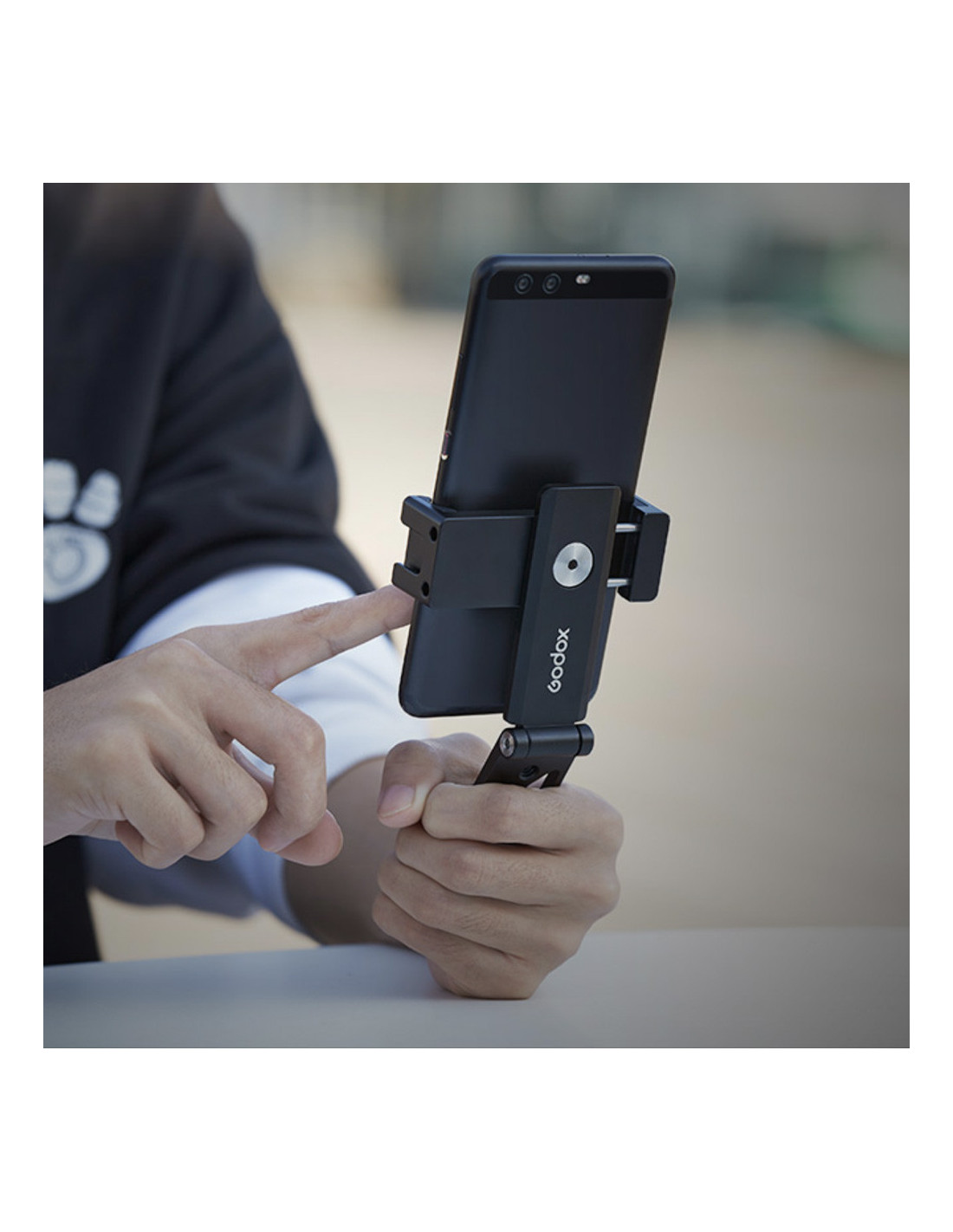 Smartphone beslag har en kold sko mount til fastgørelse af LED lamper, flash enheder og mikrofoner med en standard kold sko forbindelse. 1/4" gevind tilslutning tillader smartphone beslag skal monteres på andre enheder med 1/4" skrue.
