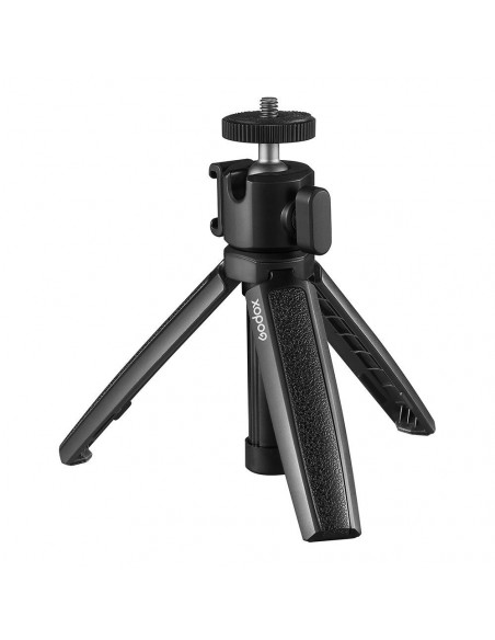 Foldet ud, kan Godox Mini Tripod & Selfie Stick bruges som både en tripod og en selfie stick. Det er lavet af plast og har nogle aluminium dele. Den har en integreret, vippelig og drejelig ball head med en 1/4" 20 monteringsskrue.