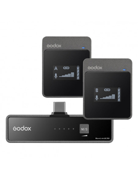 Godox MoveLink UC2 Compact Digital Wireless Microphone system til telefoner og tabletter med en USB type C (2,4 GHz). For telefonbrugere er UC1- og UC2-pakkerne udtænkt, hvor receiver har en telefons størrelse og format og kan tilsluttes via et USB C stik.