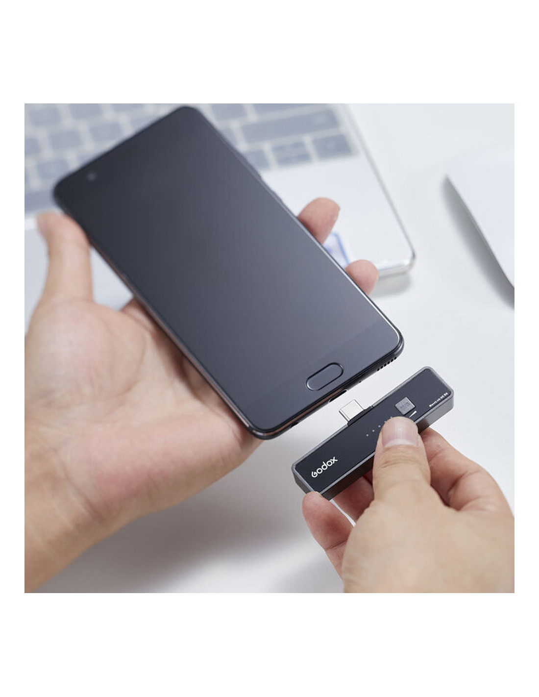 Godox MoveLink UC2 Compact Digital Wireless Microphone system for phones and tablets with a USB Type C (2.4GHz). For phone users, the UC1 and UC2 packages have been devised where the receiver has the size and format of a phone and can be connected via a USB C connector.