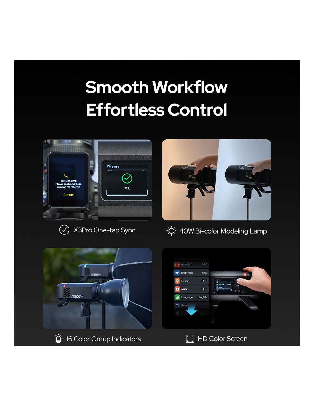 The AD80OPro features professional modes such as Freeze, Stable Colour Temperature, HSS, Multi and more, allowing photographers to reliably handle fast action, products and colour-critical work.
