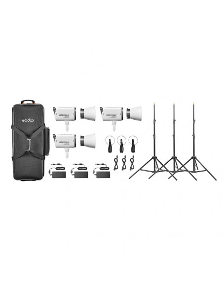 The Godox Litemons LA300R RGB LED Video Light 3 light kit (White) consists of a set of three LED video lights and light stands. A complete set that allows you to get started right away.