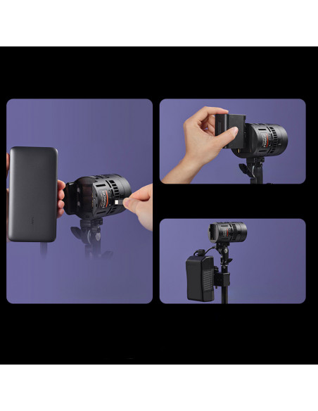 The RS60 series offers versatile power supply options, including a fast charging, removable battery for outdoor and mobile use. It also features the latest third generation GaN semiconductors in the all in one detachable power adapter, which offers higher power conversion efficiency in a more compact design no more hassle with separate adapters. Simply connect the 8 shaped power cable or use the E27 socket adapter for a seamless power supply, so you can effortlessly integrate the RS60Bi into any scene as downlights, spotlights or stage lighting.