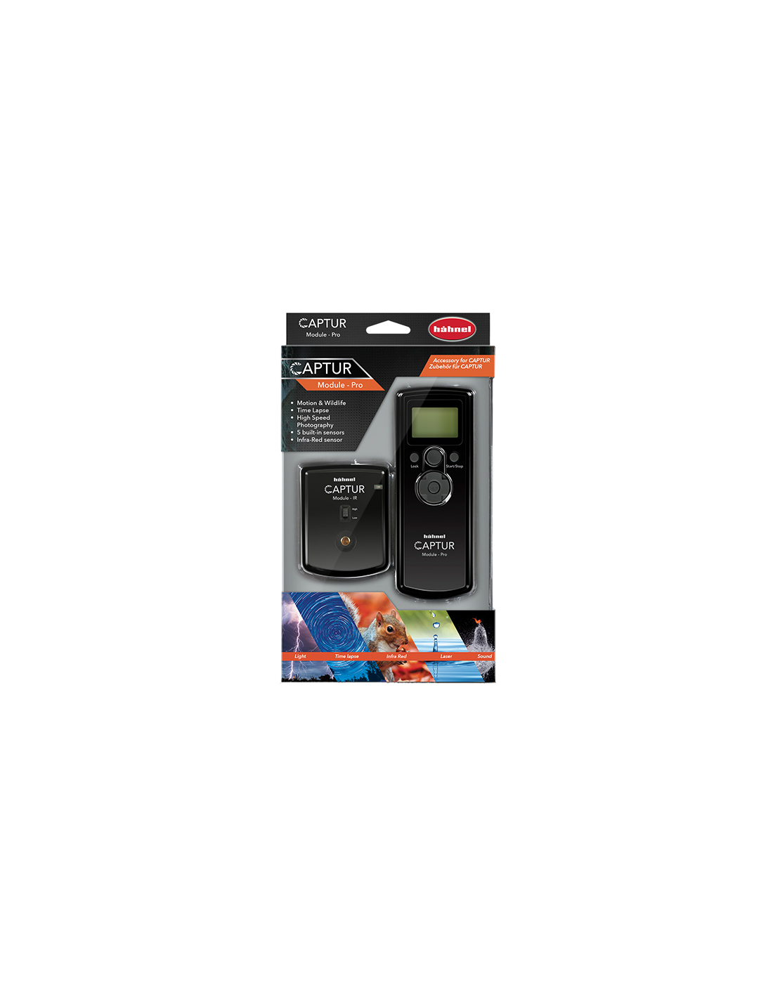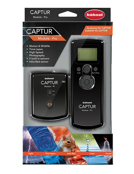 HÄHNEL CAPTUR MODULE PROEndnu et fantastisk tilbehørsprodukt til Captur er den trådløse Module Pro.Dette modul har indbygget bevægelses-, lys- og lydsensor samt AUX-indgang til tilslutning af tredjeparts sensorer, som fx tryksensorerOmfatter også Modul-IR, som kan udløse kameraet, når en bevægelse bryder strålen. Perfekt tilfotografering af dyreliv og sport.Til tidsindstillet fotografering, højhastighedsfotografering, bevægelses- og dyrefotograferinggFire indbyggede sensorer (lys, lyd, laser * og IR)AUX-indgang til tilslutning af tredjeparts sensorer, som fx tryk-, fugt- og temperatursensorerFuldt programmerbare tidsindstillinger, forsinkelses-timer, interval-timer, antal eksponeringer og eksponeringslængdeUdløserknap med autofokus, single & kontinuerlig fotografering & bulb-tilstandTilsluttes trådløst til kameraet ved hjælp af "Captur" (sælges separat)