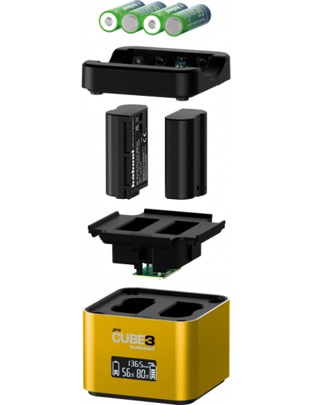 Hähnel ProCube 3 Twin-opladerLeveres med de nødvendige batteriplader til Nikon EN-EL14 / EN-EL15 / EN-EL25 og AA-batterierOplader 1 eller 2 kamerabatterier på samme tidHurtig opladning på 15 minutter - mAh-aflæsning viser, hvor meget kapacitet der er tilføjet under opladningen (viser ikke, hvilken kapacitet der allerede er i batteriet)LCD-display med omfattende opladningsinformationBatteriets sundhedstjekUSB Type-C PD 3.0 30 Watt-indgangsstik (fungerer med enhver USB-C-adapter / powerbank)Intelligent hurtig IC-opladningskontrolIntegreret 2A USB-A-port til opladning af USB-enhederAA-bakke oplader 4 AA-batterier samtidigt (oplader kun, når 4 AA-batterier er indsat samtidigt)ProCube3 kan oplade både originale kamerabatterier og tredjepartsbatterier.Kabelløs batteripladeBatteripladen kan udskiftes med en anden version uden kabel, som gør, at din oplader kan bruges til flere typer kamerabatterier (og AA-batterier).Kompatible batterier (opladningsplader fås som separate produkter)Canon: LP-E6/E6N/E6NH/LP-E6P / LP-E8 / LP-E17Sony: NP-BX1 / NP-FW50 / NP-FZ100Olympus: BLN-1 / BLS-5 / BLH-1Panasonic: DMW-BLC12 / BLF19 / BLJ31 / BLK22Fujifilm: NP-W126 / NP-W235
