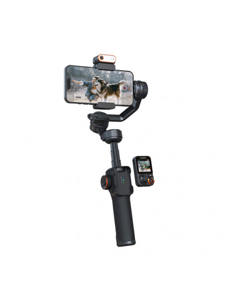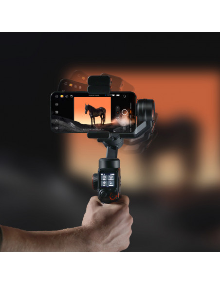 Creative freedom in video recording The Hohem iSteady M7 is ideal for content creators who want to shoot professional video with their smartphone. It is equipped with comprehensive features for filmmakers and content creators, such as built in AI tracking that accurately tracks objects and ensures smooth motion capture, a detachable touchscreen remote control and magnetic RGB and CCT fill ligth for customisable lighting. Highlights AI powered gesture control Flexible recording modes Detachable remote control with touchscreen AI powered gesture control The iSteady features start and stop AI tracking and can trigger the shutter, allowing hands free operation. Light but robust construction Weighing 361 grams, it is made of high quality composite material and has making it sturdy and portable. It supports devices up to 500 grams, making it suitable for larger smartphones and lightweight cameras. Built in extension rod and flexible shooting modes The iSteady features a built in 193 mm extension rod and offers versatile flexible shooting modes such as gimbal working modes including Pan tracking, Pan and Tilt tracking, viewpoint (POV), custom mode, lock mode, sports mode and ultra wide angle mode. Plus creative functions including Auto Inception, panorama and motion timelapse for different shooting styles. Detachable touchscreen remote control The iSteady M7 has a 1.4â colour touchscreen that provides access to settings, real time preview, tracking and composition adjustment within a range of <10 metres. Built in magnetic RGB and CCT fill light The magnetic RGB and CCT fill ligth for customisable lighting These lights offer extensive lighting options with customisable colours (360 colours and adjustable colour temperatures from 2700K to 6500K). Operating time and adjustable movement With a battery capacity of 3200mAh, the iSteady M7 has a usage time of up to 12 hours and a charging time of 3 hours. If misused, it switches off to prevent damage. Adjustable movement The control angles are flexible (Pan: 360°, Roll: 45°, Tilt: 50° to 275°), allowing smooth and dynamic shooting. Extension ports The iSteady has three 1/4" 20 screw holes for additional accessories, such as microphones or external lights., Weight: 361 g Dimensions unfolded: 327 x 122.3 x 118.3 mm Dimensions folded: 335.7 x 57 x 159 mm Material: High quality composite material Maximum load: 500g Mobile Width: 58~90 mm Mobile Thickness: 6.9~12.5 mm Gesture control: Start Al tracking; Stop Al tracking; Shutter control; Custom composition Detachable remote control: 1.4â colour remote control with touch screen; Real time preview; Tracking target selection and custom composition; Parameter setting Magnetich Fill light: CCT and RGB fill light Built in extension rod: 193 mm Battery capacity: 18650li ion, 7.2V/3200mAh/23.04Wh Charging time: 3 hours Operating time: approx. 12 hours (balanced and idle) Power consumption: 1.8 W (balanced and stationary) Adjustable angle: Pan: 360°; Roll: 45°; Tilt: 50° to 275° Gimbal operating modes: Pan tracking (PF); Pan and Tilt tracking (PTF); Point of view (POV); custom mode; all lock mode; sports mode; ultra wide angle modeOther shooting modes: Auto Inception; Panorama; Motion Timelapse Landscape/Portrait switch: Manually rotate the phone clamp; Rotate the handle Operating temperature: 10°C to 45°C Motor protection: The gimbal automatically shuts down during improper use to protect the motor. Extension port: Three expansion ports (1/4" 20 screw hole) Remote control Battery capacity: 3.8V/240mAh/0.912Wh Remote control range: <10m Range of video transmission: <7m Touchscreen: 1.4 inch AI driver Weight: 20g Dimensions: 42.5 x 29.5 x 19.5 mm Pixel: 2 Mp Gesture recognition distance: 0.5m ~ 5m Tracking distance: 0.5m ~ 7m Illuminance: 40lux@0.5m Light power: 2W RGB: 360 lighting colours CCT: 2700K, 3000K, 3500K, 4000K, 4500K, S000K, 5500K, 6000K, 6500K , iSteady M7 Advanced Al Tracker with fill light Detachable remote control with touchscreen Tripod Carrying case USB Type C Charging cable Type C charging cable