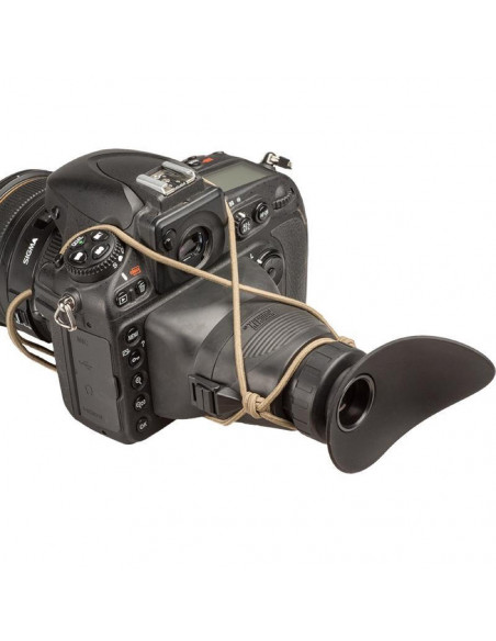 Live View Shooting is greatly enhanced by mounting your HoodLoupe over your LCD screen. Glare free images help you compose and pull focus like a pro. Mounting is easy. Place the section between the knots over your HoodLoupe eyepiece so it rests under the eyepiece. Next, crisscross the mounting cords around the lens for a secure mount. (see photo on package front) Lastly, tighten cords by squeezing the black cord locks and sliding cord locks into the desired position. ,